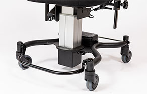 As standard, the chair has rear wheel brakes that are controlled using a brake lever. This is installed by either the left or right rear wheel. The chassis can be upgraded with a brake handle that is installed under the seat within reach of the user on either the right- or left-hand side. Brakes can be fitted on front wheels, rear wheels, or all four wheels.