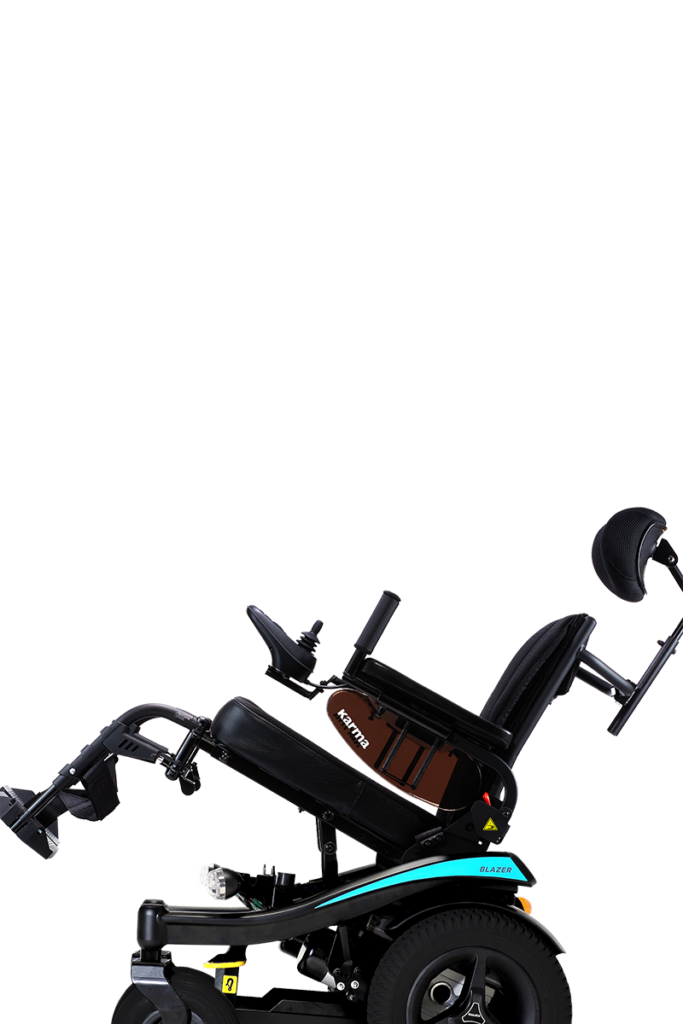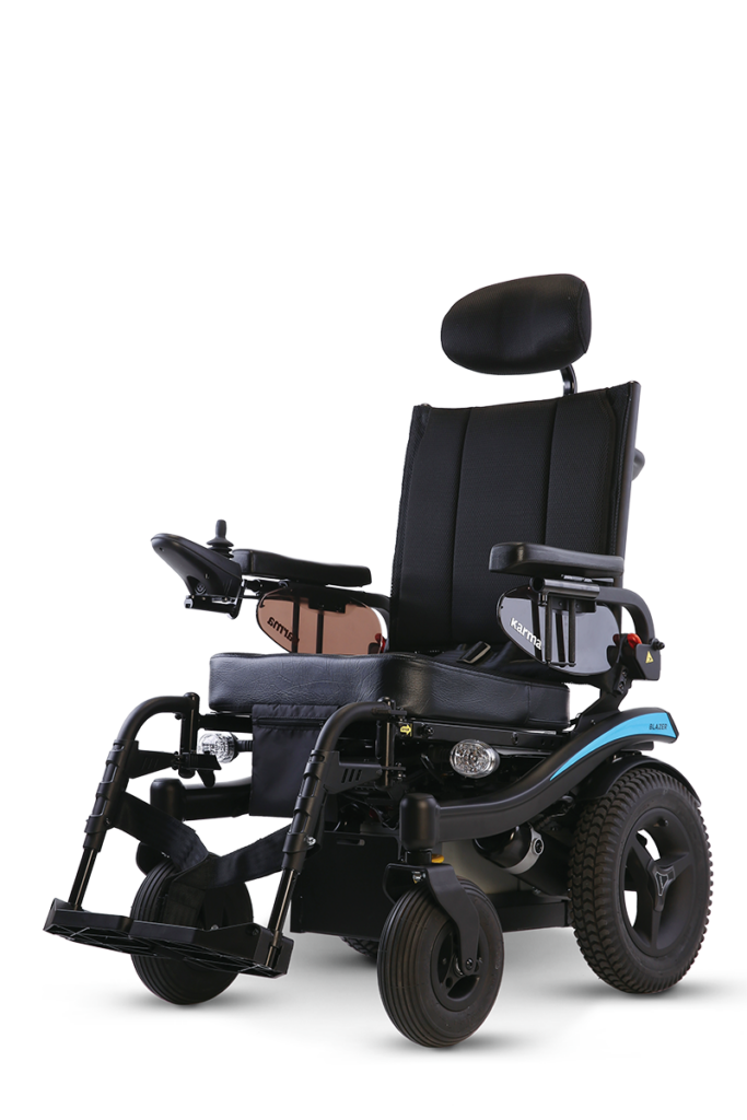 Karmas centrumdrivna elektriska rullstol med minimal svängradie. Utrustad med det nya justerbara sitssystemet som passar användare i alla storlekar.